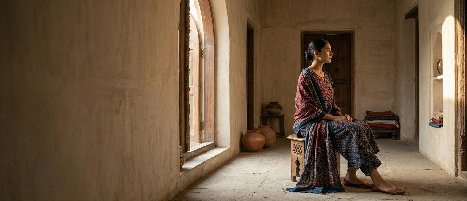 Beige Handloom Striped Kurta with Patchwork Tissue Dupatta & Upada Silk Bottom – 3 Piece